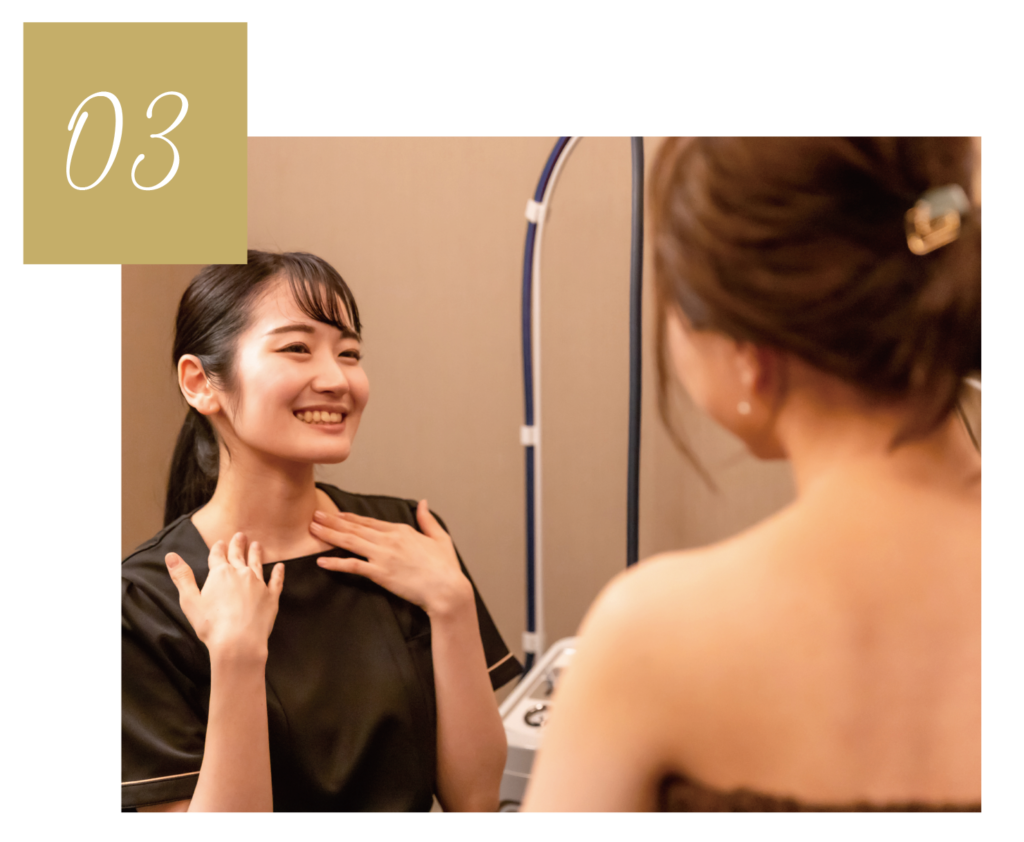 スタッフがマシンの操作説明や使い方の指導をいたします。自分のペースでエステをお楽しみくだ さい。美容機器の使い方がわからない場合などはスタッフが丁寧にサポートいたしますので、お気 軽にお声がけください。 所定の時間が経過したら、セルフエステ終了とな ります。