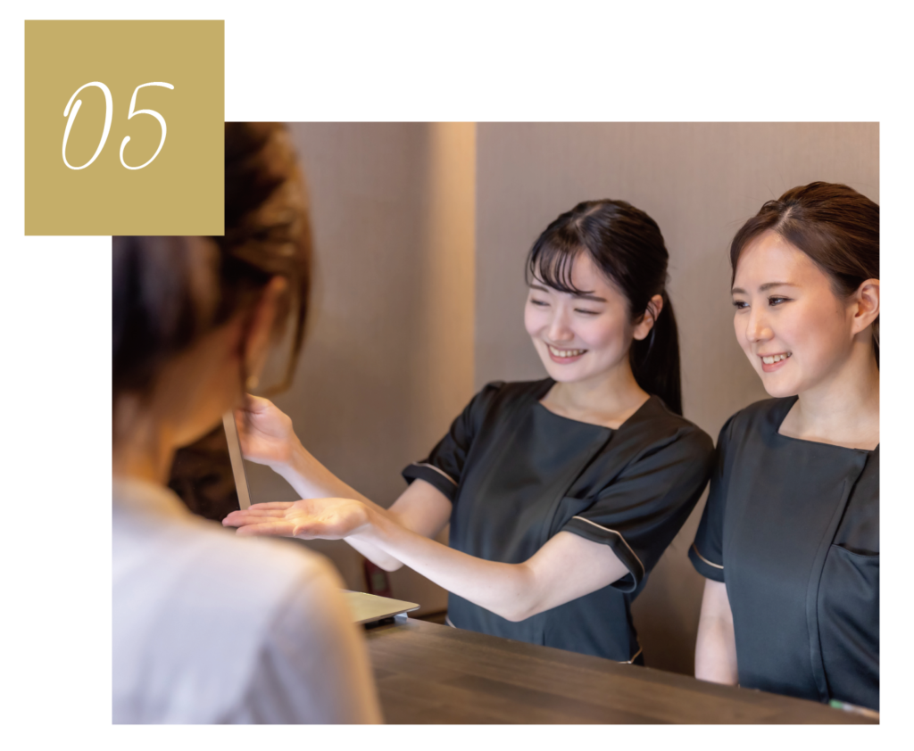 お着替えを済まして、お片付けをして頂きます。 美容液が付いた機器を拭取りゴミはゴミ袋に捨て て頂きます。最後はお部屋にお忘れ物が無いか確 認してください。